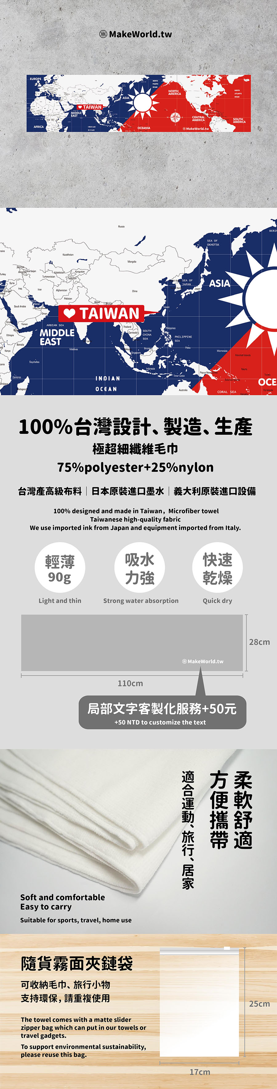 1. 100%台灣生產,輕薄快乾好攜帶,不易產生異味