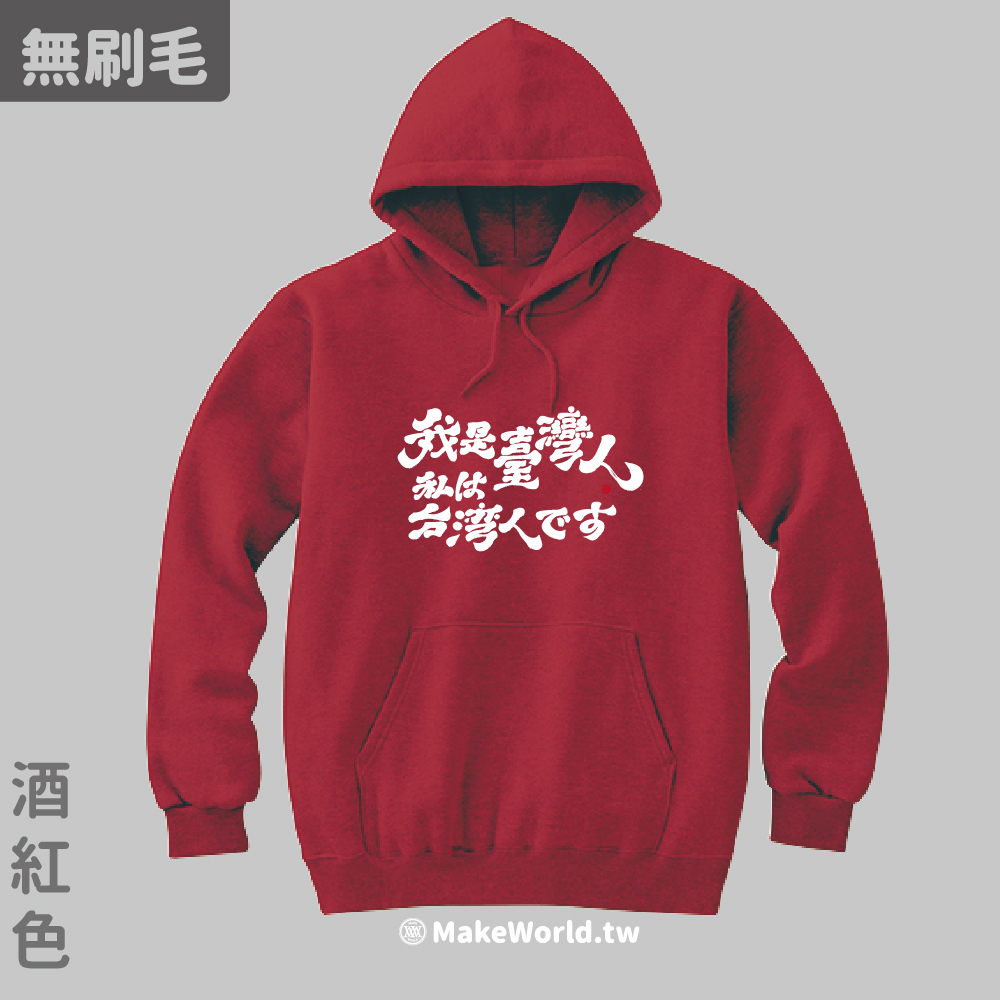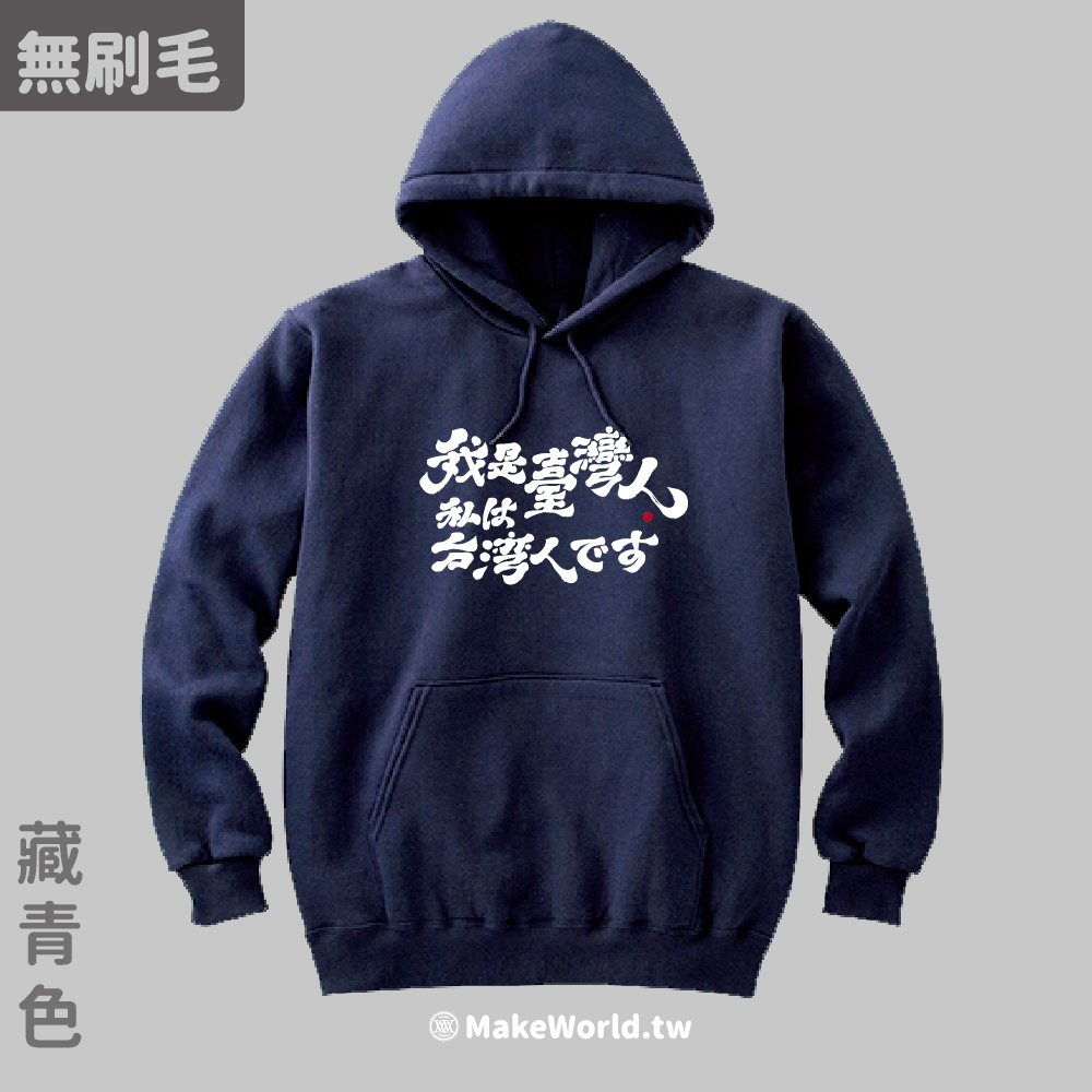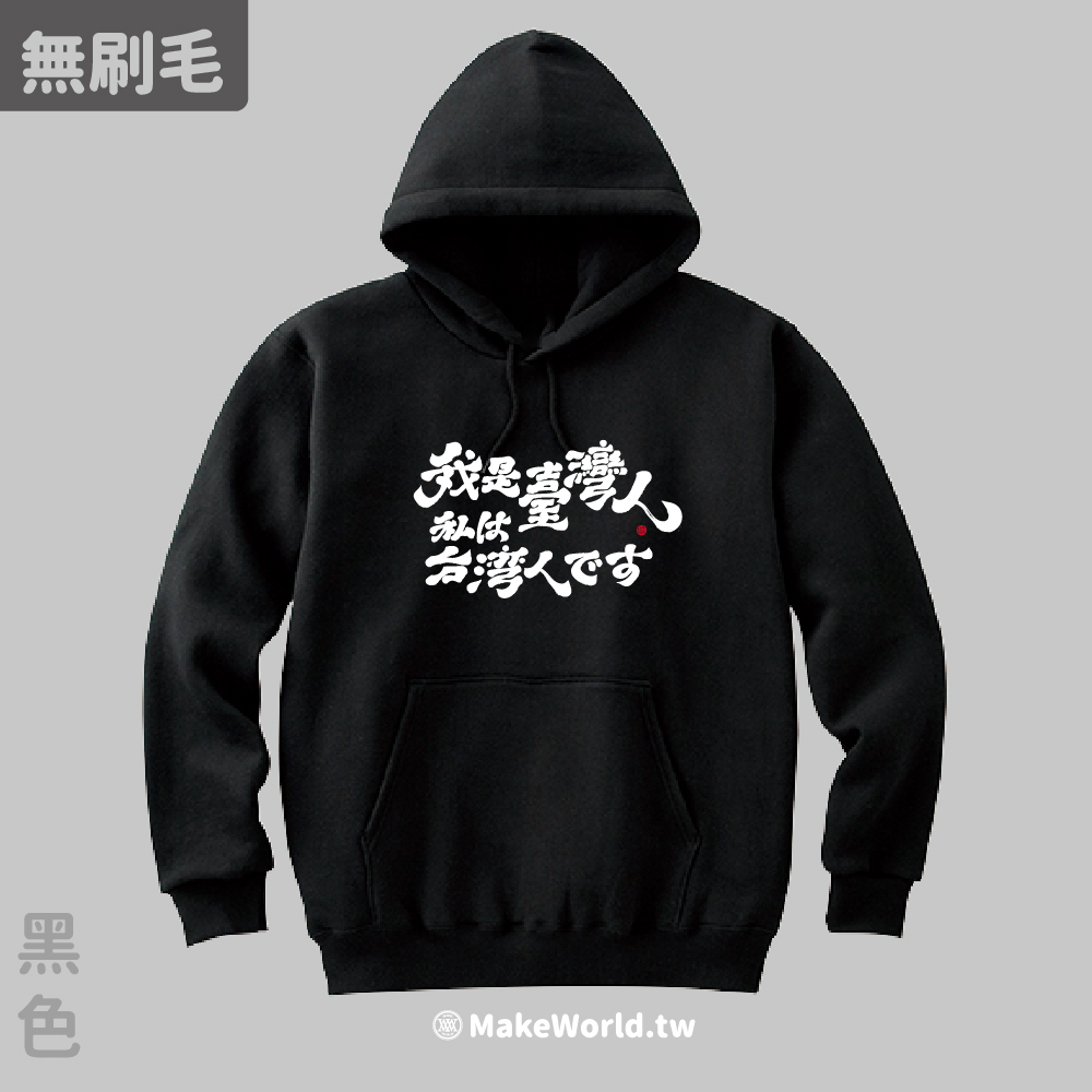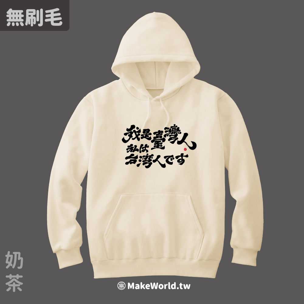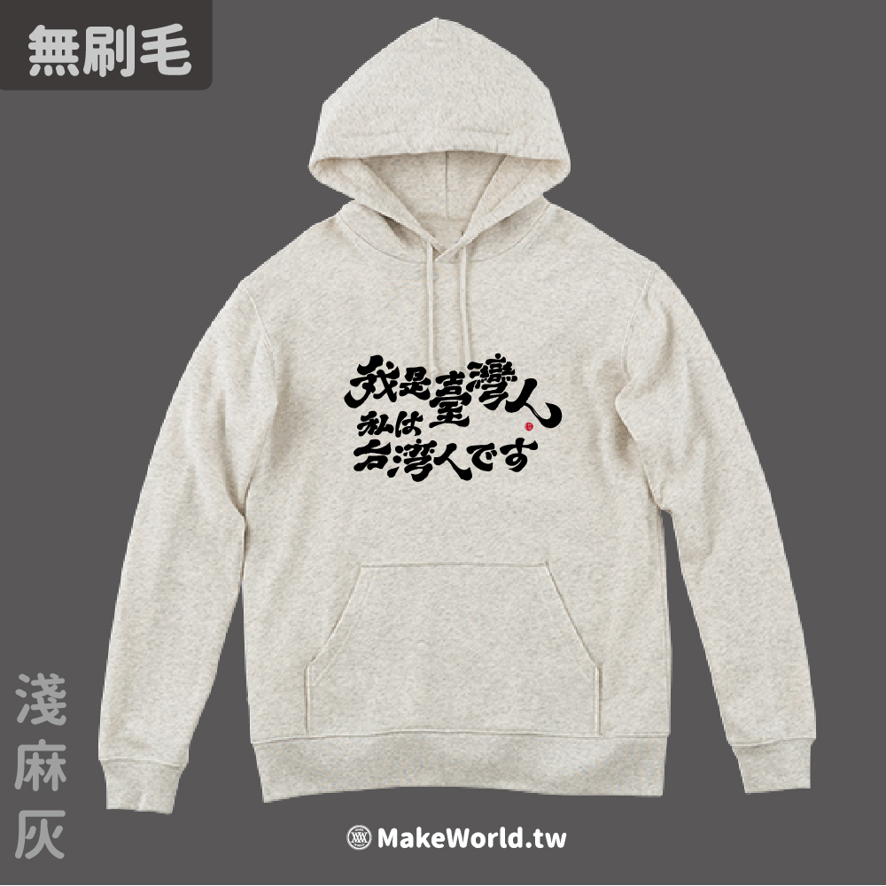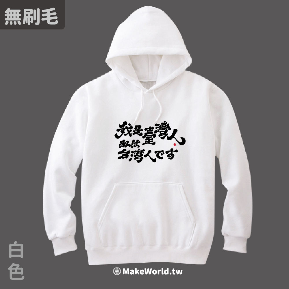 規格型號 MakeWorld.tw 純棉無刷毛帽T (克萊兒寫寫字/我是台灣人-日文)