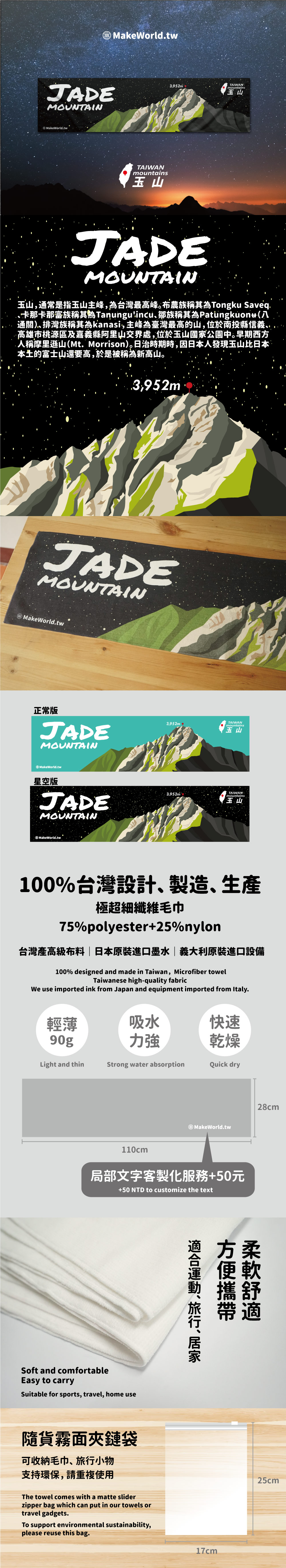 規格型號 Make World 運動毛巾 (台灣山脈-玉山/星空款)