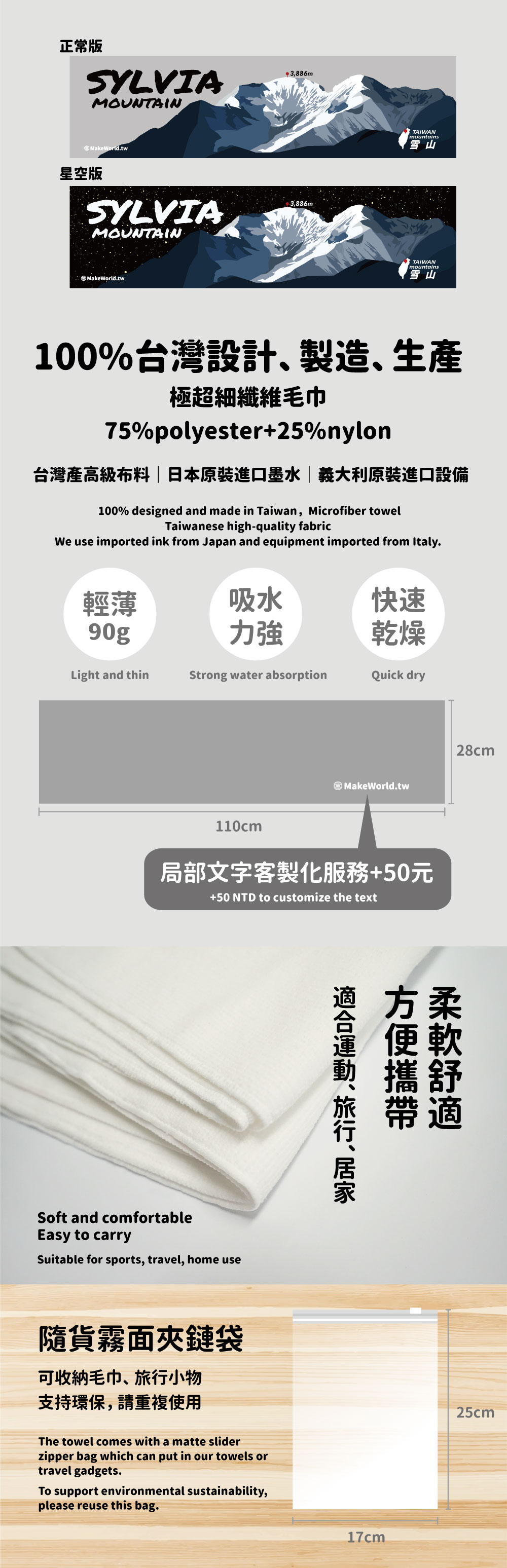 規格型號 Make World 運動毛巾 (台灣山脈-雪山/星空款)