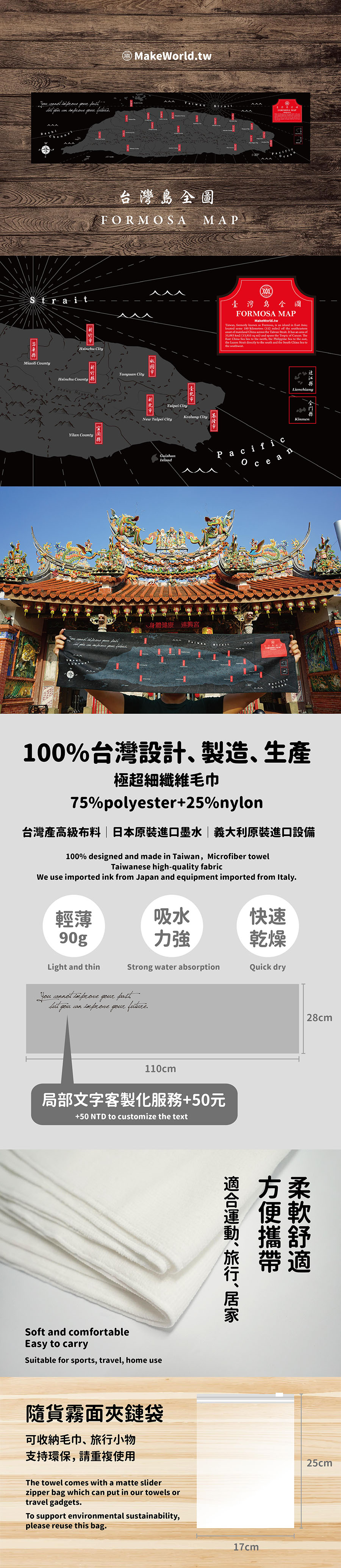 規格型號 Make World 運動毛巾 (台灣島/墨黑)