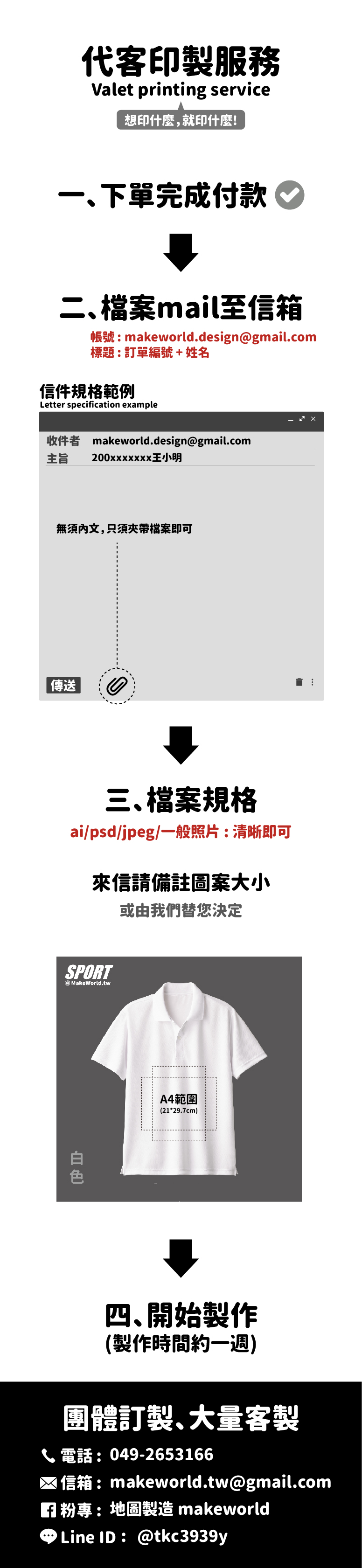 如需印製特殊位置(背面、手臂等,請先私訊或來信洽詢)