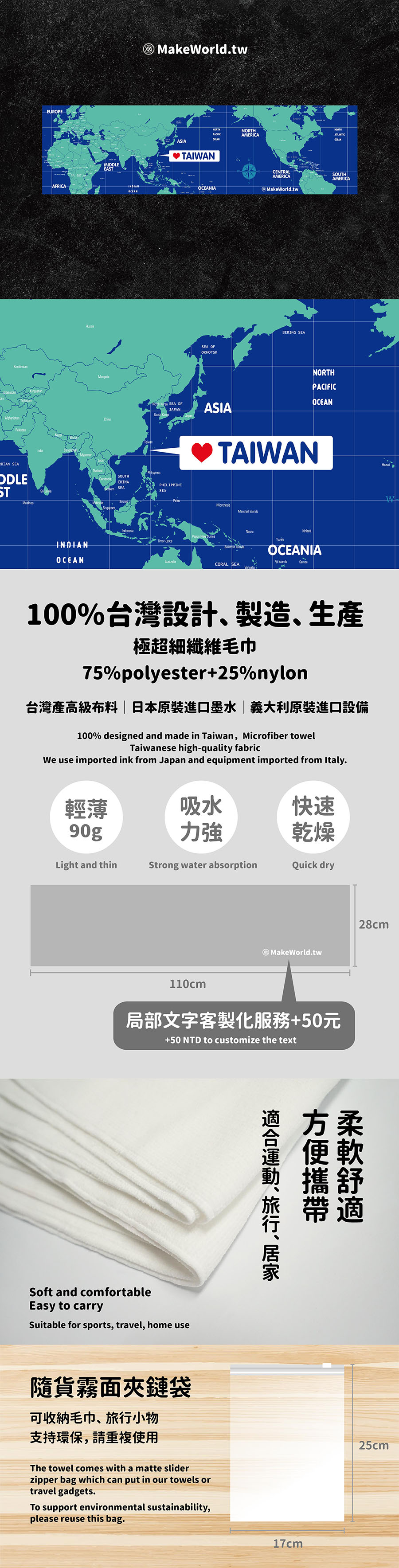 1. 100%台灣生產,輕薄快乾好攜帶,不易產生異味