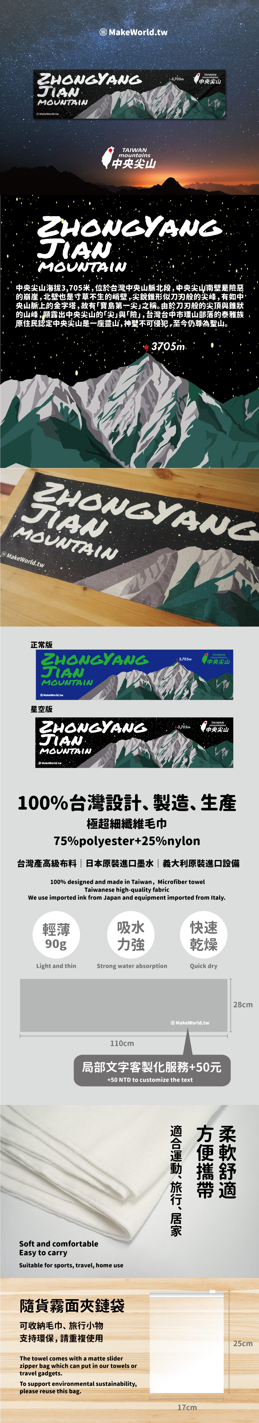 規格型號 Make World 運動毛巾 (台灣山脈-中央尖山/星空款)