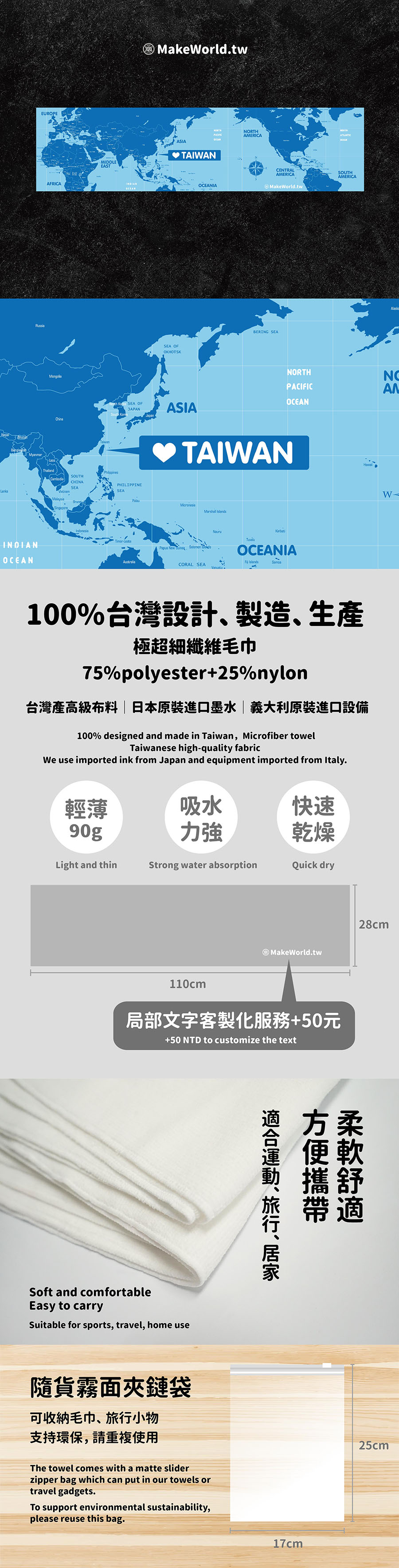 1. 100%台灣生產,輕薄快乾好攜帶,不易產生異味