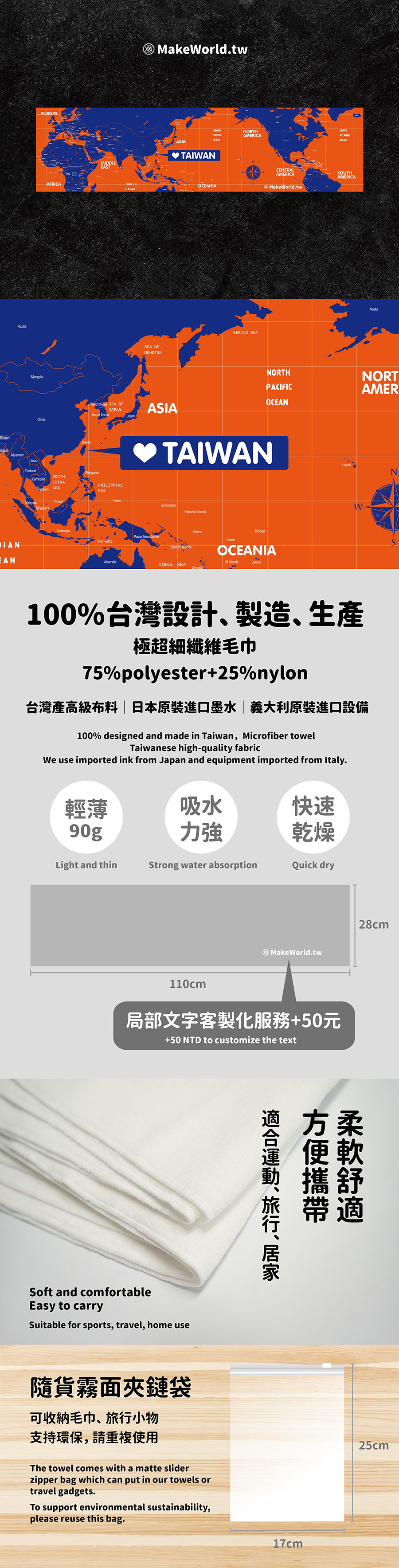 1. 100%台灣生產,輕薄快乾好攜帶,不易產生異味