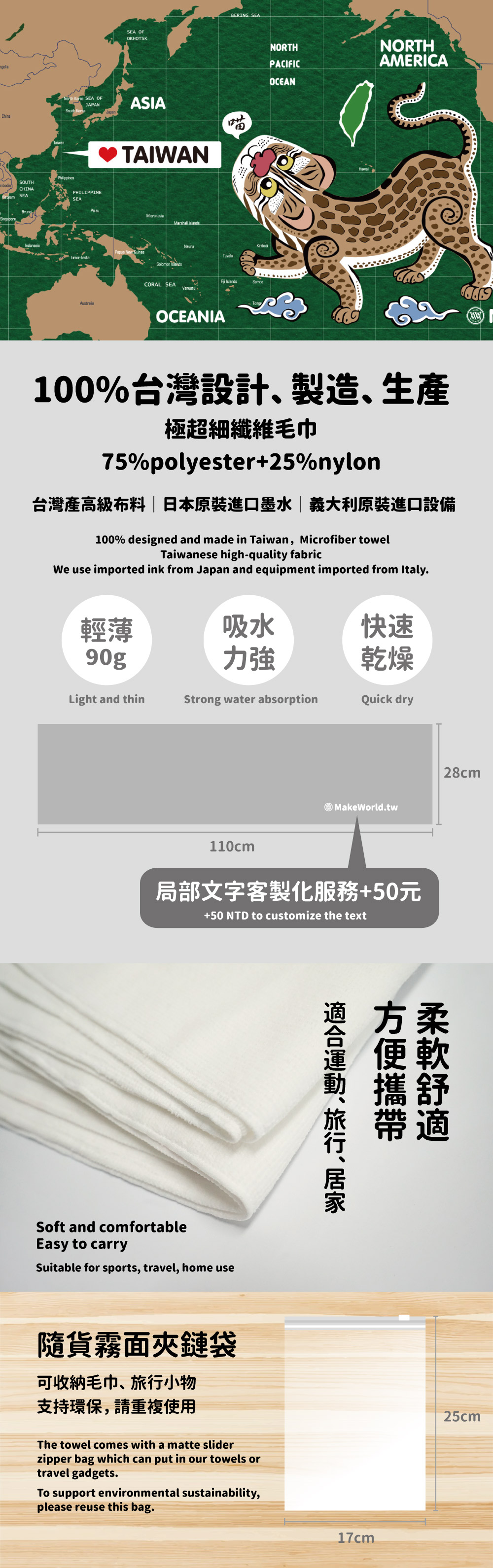 1. 100%台灣生產,輕薄快乾好攜帶,不易產生異味
